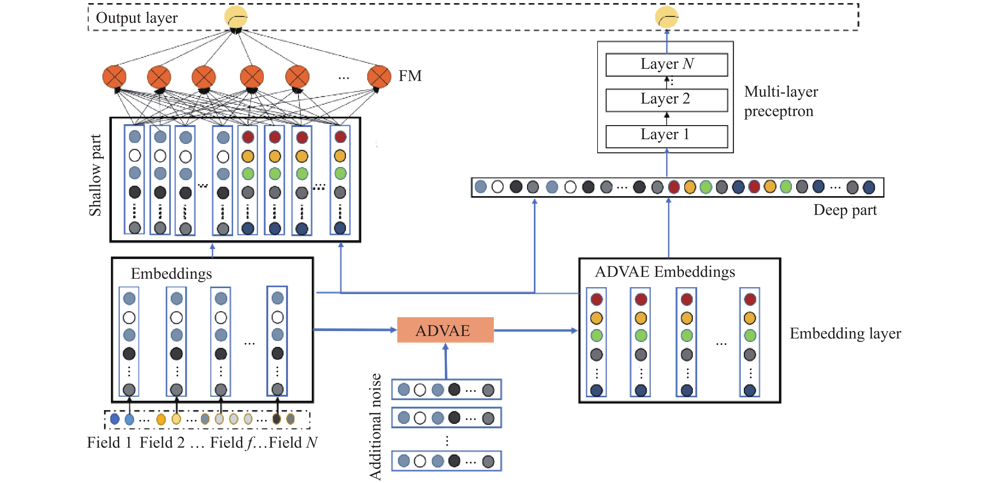 基于上述问题, 本文提出了一种基于改进降噪自动编码器(DAE)[17]的点击率预测模型ADVAE (ADditional Variational AutoEncoder). 该方法通过添加噪声来生成嵌入信息来学习稀疏和高维输入特征的稠密低维表示, 提高了模型在bit-wise和vector-wise层次的特征交互能力, 改善由于数据稀疏性引起的特征不平衡问题. 同时, ADVAE模块使得模型即使在数据样本特征稀疏甚至缺失情况下, 也可以产生有效的嵌入表示, 有效缓解了推荐系统中常见的冷启动问题. 同时, 该模型的ADVAE模块可以针对不同任务动态地应用于到其他模型, 具有很强的灵活性.
