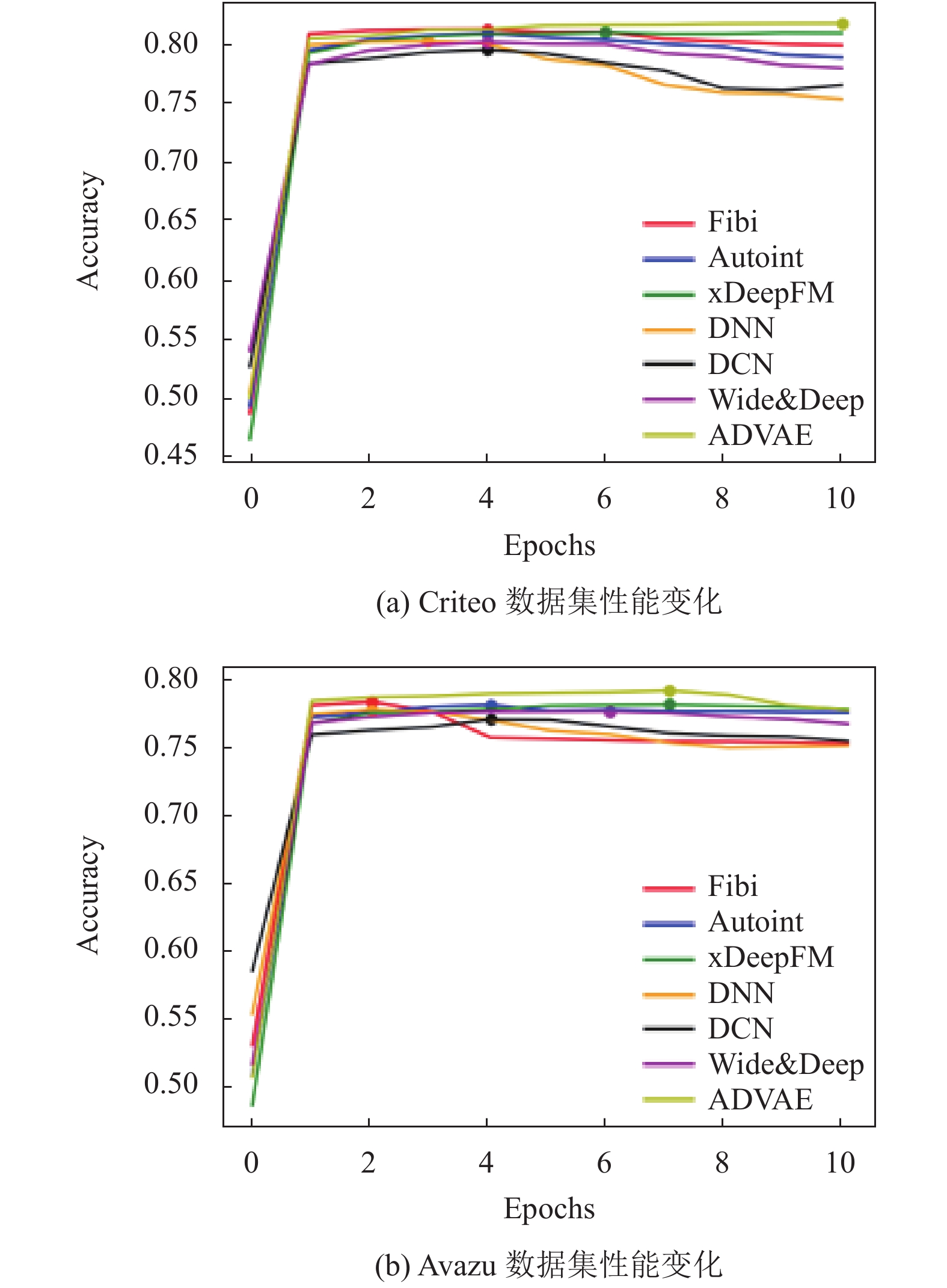 3.2 点击率预测实验表3反映了各个模型在Ctriteo、Avazu和Movielen-20M数据集上的性能表现. 可以看出, AVDAE在各个数据集上的表现均优于现有模型. 在实验中, 我们发现使用多层感知器(MLP)往往会导致过度拟合, 如图3所示对于Wide & Deep, xDeepFM和DNN之类的几种模型, 通过使用多层感知器(MLP)训练约4个epoch时的准确率开始下降. 但是, 在使用ADVAE模块后时, 在Criteo数据集上训练10个epoch以及Avazu数据集上训练8个epoch之后, 准确率仍有所提高, 实验结果说明, 这种动态嵌入方式极大地减轻了MLP的过度拟合的问题.